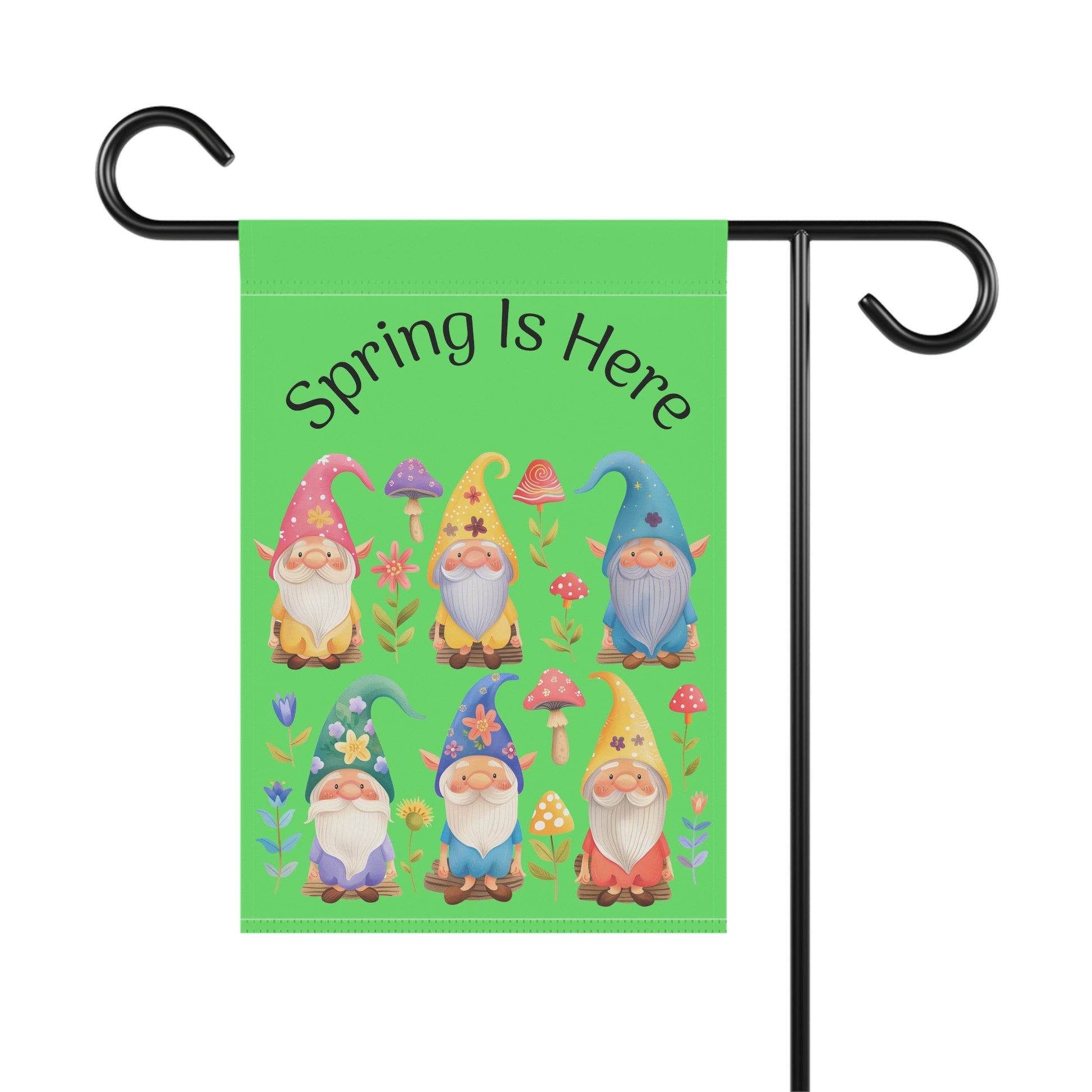 A cheerful garden banner that brings playful color and springtime charm to your outdoor spaces. Bright, smiling garden gnomes and whimsical mushrooms pop against a fresh green background with the friendly headline “Spring Is Here.” Lightweight yet durable poly poplin-canvas keeps the print vivid while the black-lined double-sided design ensures the artwork reads from both directions. Slide it onto any standard garden pole or stand to add an inviting, happy note to porches, flower beds, and pathways during the season.
